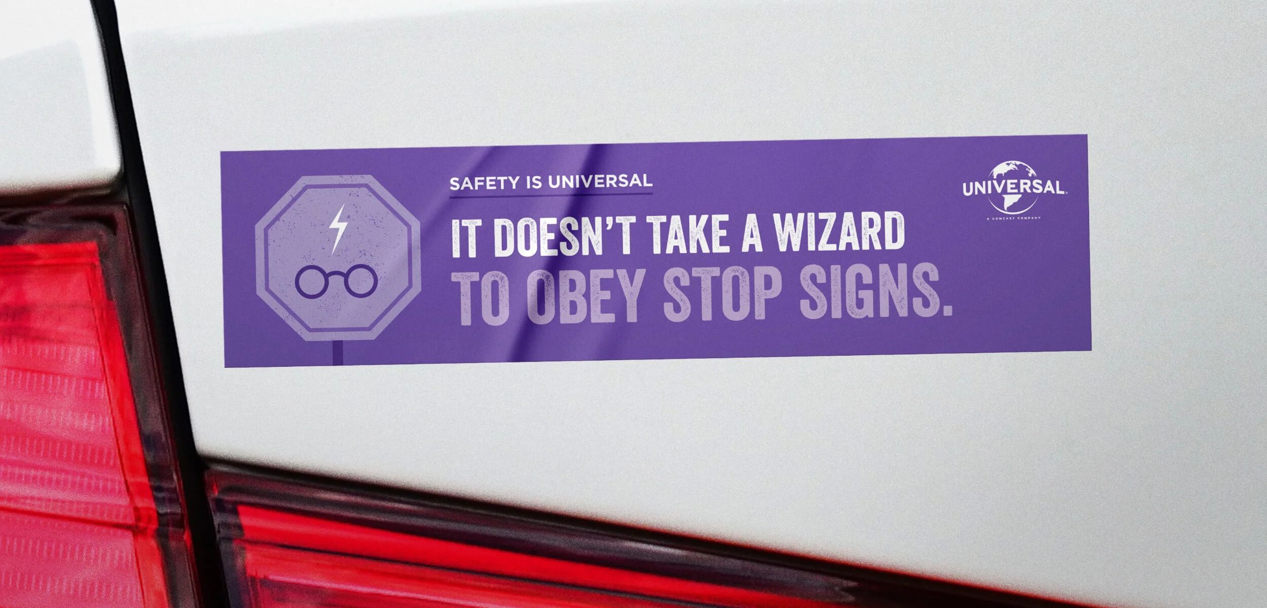To bring a creative spirit and a little bit of fun to this utilitarian message, our creative approach tied in references to some of the studio’s most iconic films while clearly communicating the important traffic rule touch points. In addition to instructional signage, we designed a plan to place campaign messaging into off-road assets, including the coffee cups used in the lot’s cafes and craft services, as well as key chains, car magnets and bumper stickers.